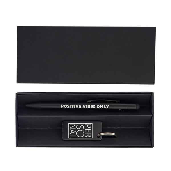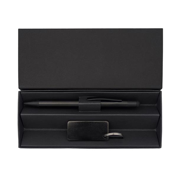 Zestaw promocyjny składający się z długopisu i breloczka wykonanych z aluminium pochodzącego z recyklingu. Całość zapakowana w czarne, kartonowe pudełko. Długopis z niebieskim wkładem.