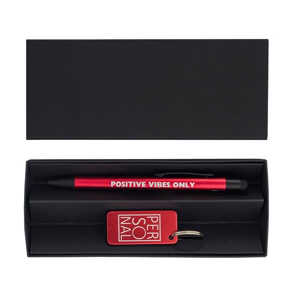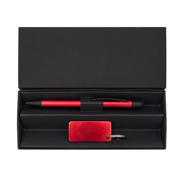 Zestaw promocyjny składający się z długopisu i breloczka wykonanych z aluminium pochodzącego z recyklingu. Całość zapakowana w czarne, kartonowe pudełko. Długopis z niebieskim wkładem.