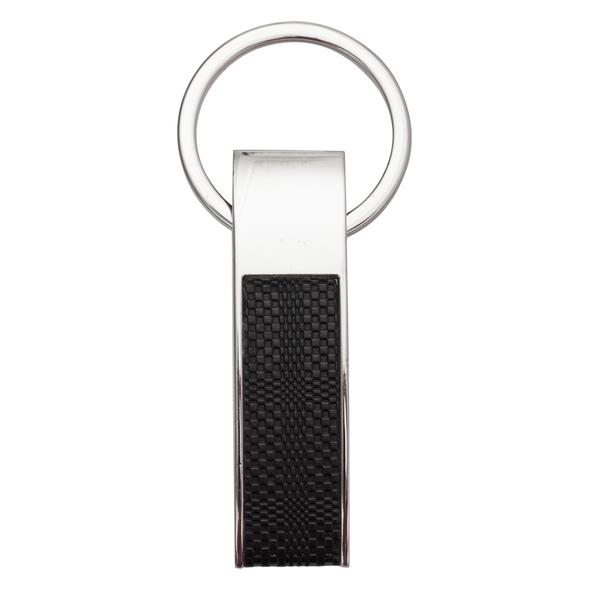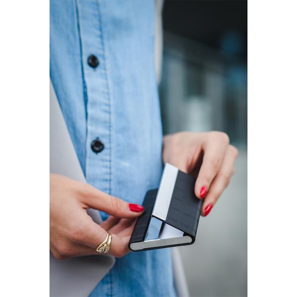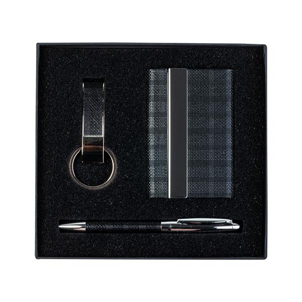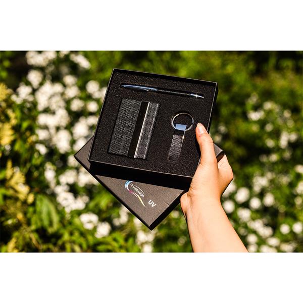 Wykonany z metalu i ekoskóry zestaw upominkowy składający się z breloka, wizytownika na 15 wizytówek i długopisu wyposażonego w niebieski wkład. Pakowany w opakowanie upominkowe.