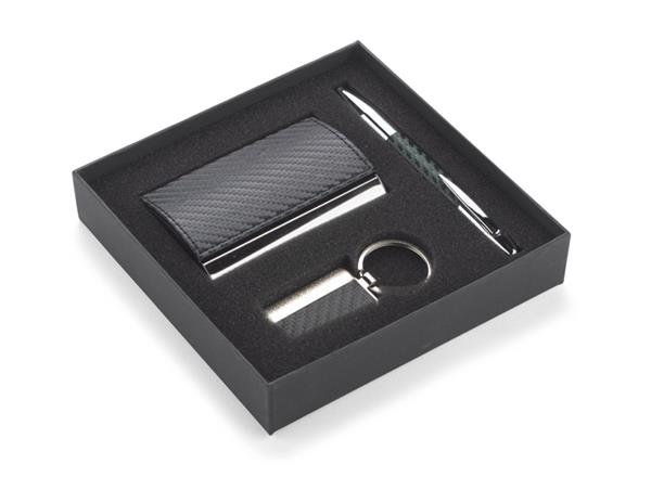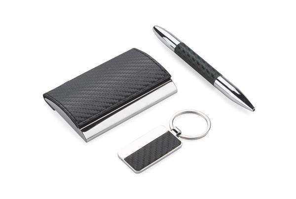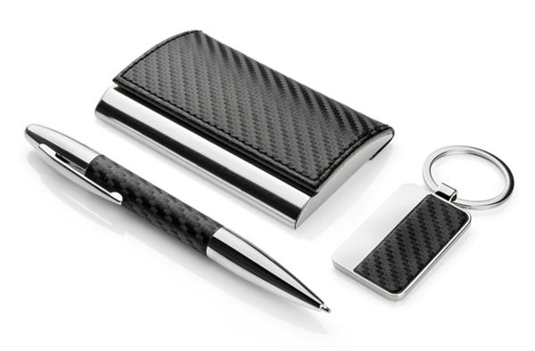 Elegancki zestaw upominkowy w skład którego wchodzą wizytownik, brelok oraz długopis. Całość zapakowana w czarne puełko. Logo wygrawerujemy na breloku albo nadrukujemy na wizytowniku.