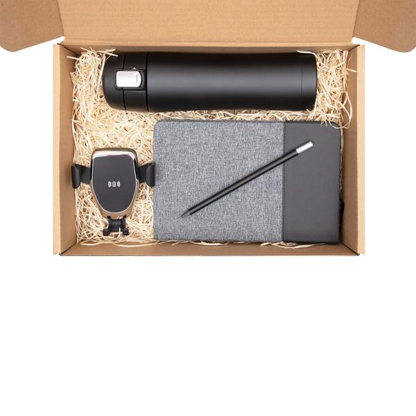 Zestaw upominkowy składający się z ładowarki indukcyjnej do samochodu (R50166.02), kubka próżniowego (R08424.02), notesu (R73657.21) i ołówka (R73812.02). Całość pakowana jest w tekturowe pudełko wyściełane naturalnym wypełniaczem (wełna drzewna). W tekturowym pudełku poszczególne elementy zestawu są w opakowaniach fabrycznych.