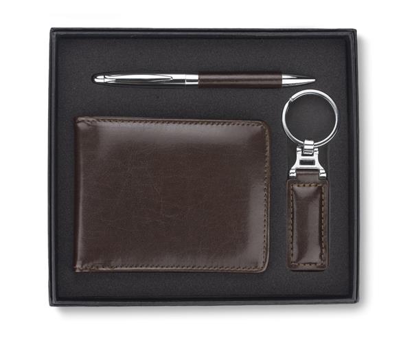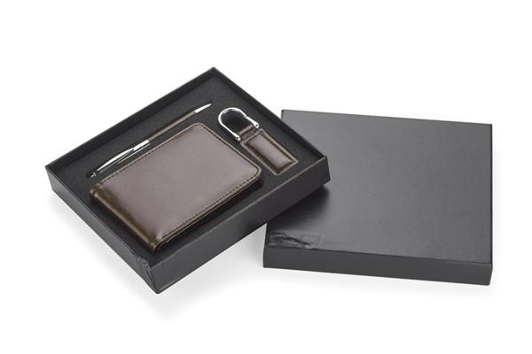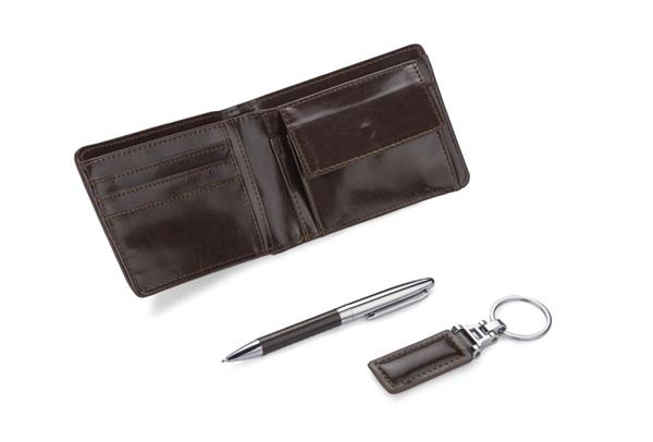 Komplet upominkowy zawierający portfel, brelok oraz metalowy długopis. Portfel wykonany z ekoskóry zawiera 2 przegródki na banknoty, kieszeń na bilon oraz dodatkowe kieszenie na karty kredytowe czy paragony. Całość zapakowana w eleganckie czarne pudełko. Grawerujemy na każdym elemencie lub na pudełku. Wymiary produktu 115 x 91 x 15 mm (portfel), 133 x ?10 mm (długopis), 65 x 25 x 5 mm (brelok), 181 x 163 x 31 mm (opakowanie)