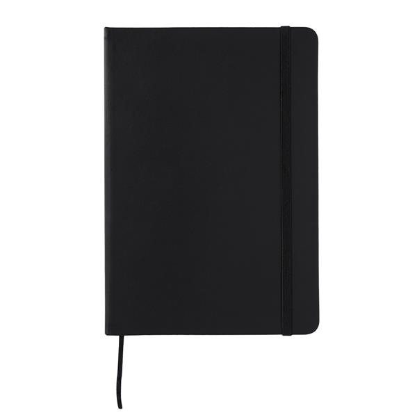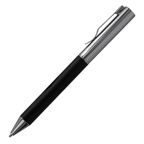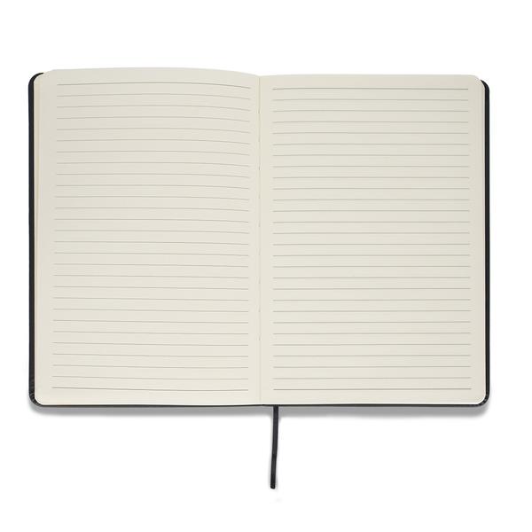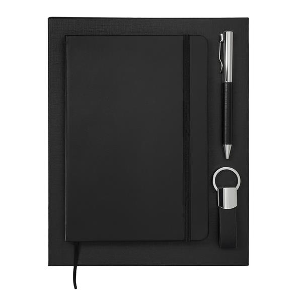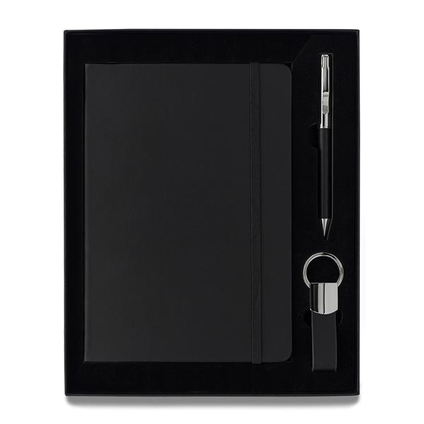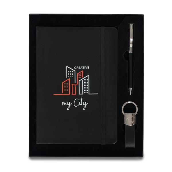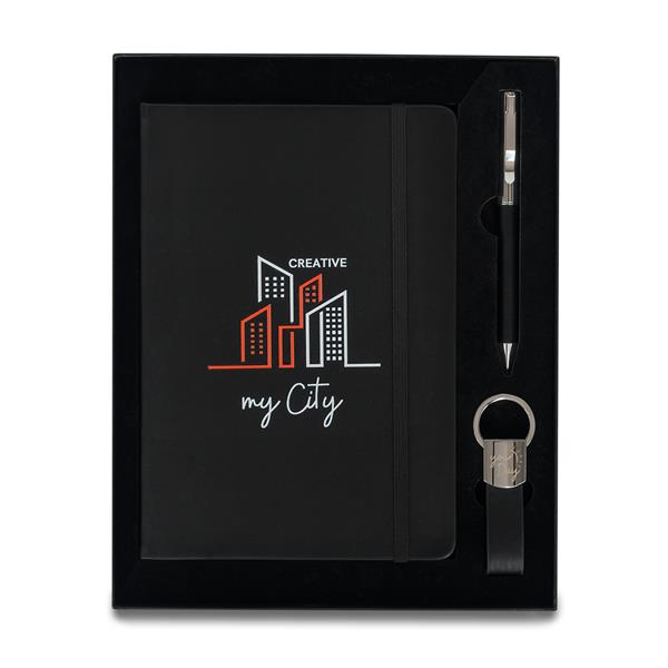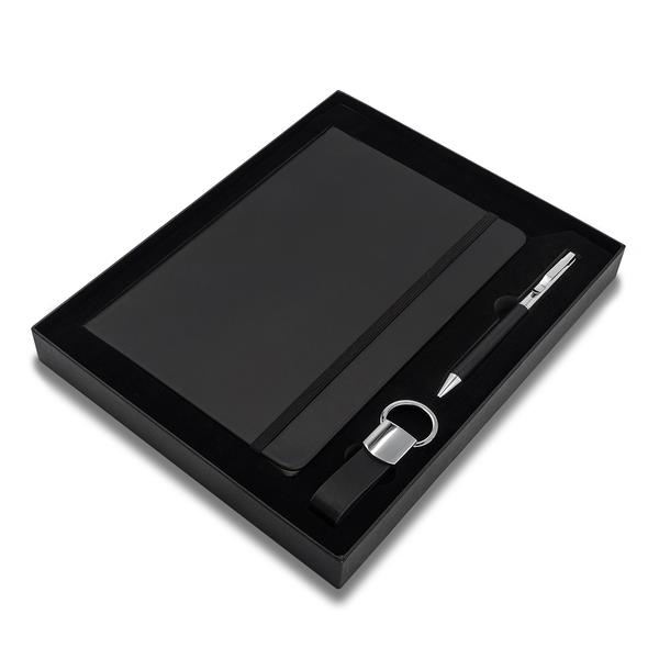 Zestaw upominkowy składający się z notesu A5, długopisu i breloka. Notes w twardej oprawie, 80 kartek w linie (papier 70 g/m2). Długopis wyposażony w niebieski wkład. Brelok do kluczy. Wszystkie elementy w wykończeniu z eko skóry. Zestaw pakowany w czarne pudełko upominkowe.