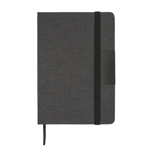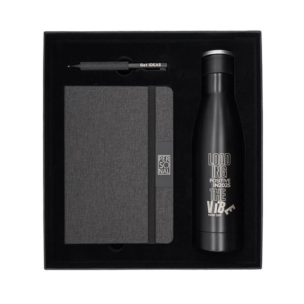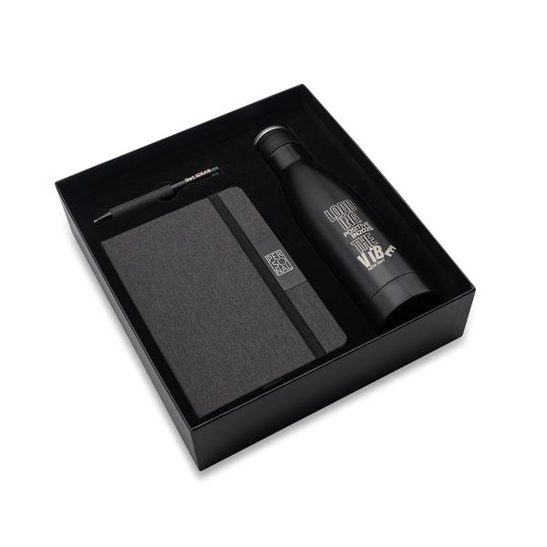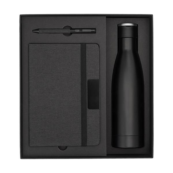 Biznesowy zestaw składający się z butelki próżniowej, notesu i długopisu. Całość zapakowana w eleganckie, czarne pudełko. Butelka próżniowa ze stali nierdzewnej o podwójnych ściankach (stal 18/8 wewnątrz, 18/0 na zewnątrz), ze składanym uchwytem. Utrzymuje temperaturę powyżej 40°C do 15 godzin. Pojemność 500 ml. Notatnik formatu A5, twarda okładka z tkaniny RPET, ozdobiona czarnym metalowym elementem; 80 kartek w kratkę, o gramaturze 70 g/m2. Metalowy długopis ozdobiony tkaniną RPET. Niebieski wkład 1,0 mm.