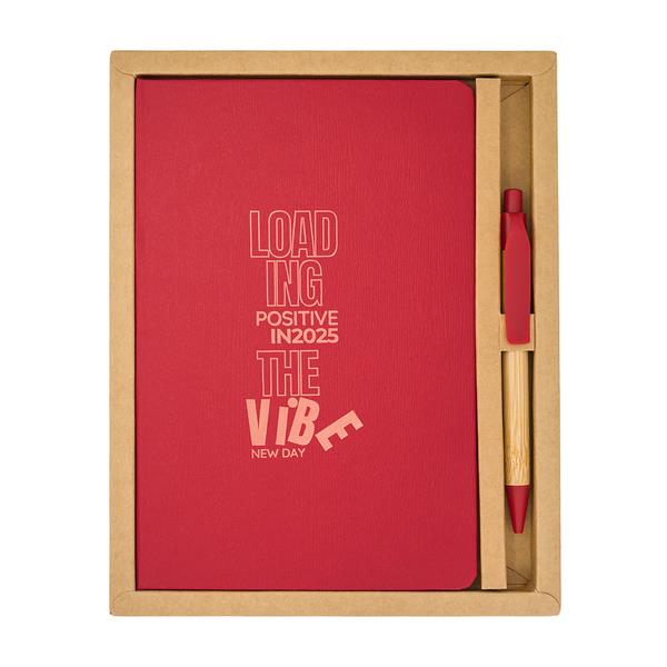 Zestaw składający się z notesu A5 w linie i długopisu. Notes w twardej oprawie z tasiemką do zaznaczania zapisanej ostatniej strony i elastyczną gumką chroniącą wnętrze. 80 kartek w kolorze kremowym (papier 70 g/m2). Bambusowy długopis, wyposażony w niebieski wkład. Zestaw pakowany jest w brązowe pudełko.
