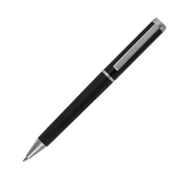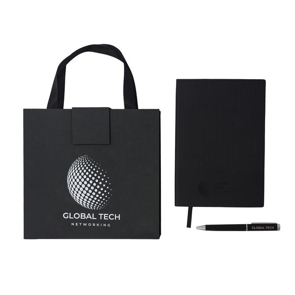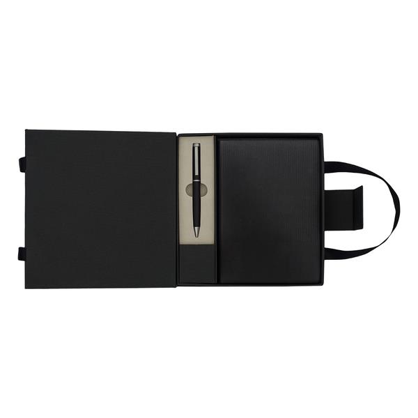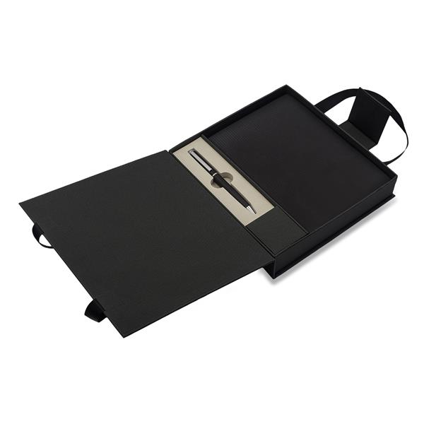 Zestaw składający się z notesu A5 (80 kartek w linie, 80 g/m2) i długopisu z niebieskim wkładem. Zestaw zapakowany w eleganckie pudełko z uchwytami.