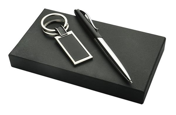Zestaw upominkowy składający się z breloka i długopisu. Długopis z czarnym wkładem. Dodatkowo brelok posiada dwa kółeczka, które ułatwią podział kluczy. Grawer zrobimy na długopisie lub też nadrukujemy logo na pudełku.