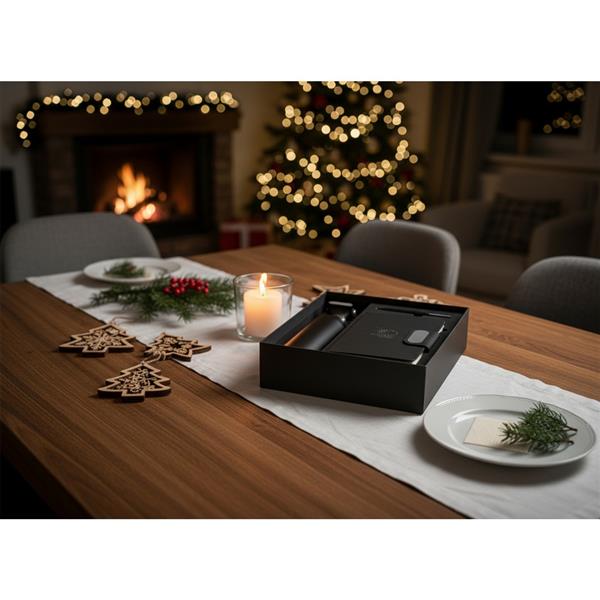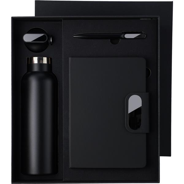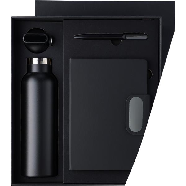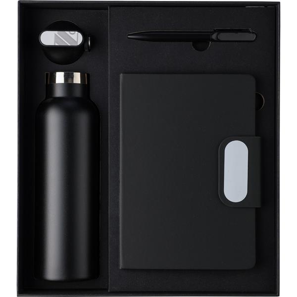 Zestaw upominkowy w ozdobnym pudełku: butelka termiczna ze stali nierdzewnej, podwójne ścianki ze stali nierdzewnej, długo utrzymuje temperaturę nie oddając jej na zewnątrz, wykonana w całości ze stali 304, uchwyt ułatwiający noszenie, długopis posiada wkład w niebieskim kolorze, notatnik 80 kartek w linie (70 g/m2), magnetyczne zamknięcie, grawerowana plakietka, tasiemka zakładkowa umożliwia wygodne zaznaczanie ostatniej strony lub ważniejszych notatek, ikona recyklingu na produkcie na wszystkich produktach, produkt wykonany z RPET