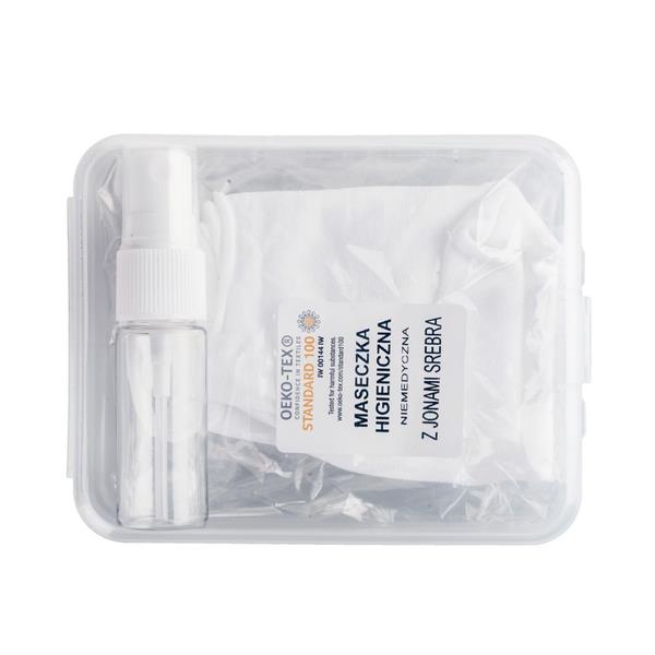 Zestaw w przezroczystym pudełku, butelka 15 ml na płyn do dezynfekcji, maseczka wielokrotnego użytku z jonami srebra, niemedyczna, posiada miejsce na filtr, wykonana w 100% z poliamidu 250 g/m2, jony srebra utrzymują się do 20 prań, temperatura prania do 90 stopni Celsjusza, wyprodukowana w Polsce