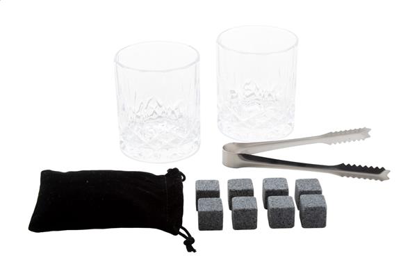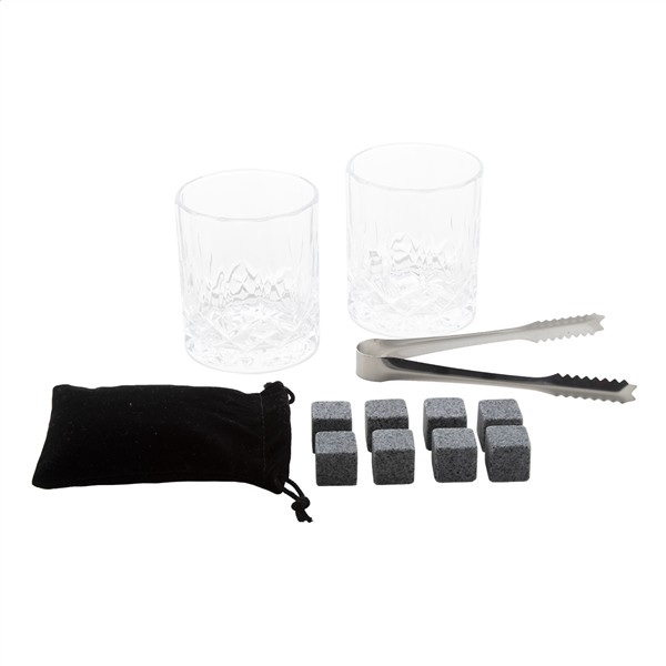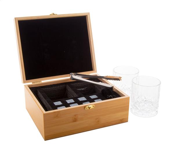 Luksusowy zestaw do whisky w bambusowym pudełku upominkowym. W zestawie 2 szklanki do whisky (250 ml), 8 kamiennych kostek lodu wielokrotnego użytku z etui do przechowywania oraz szczypce ze stali nierdzewnej.