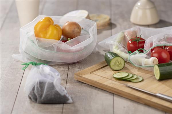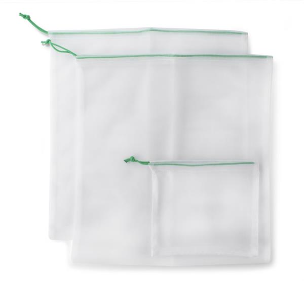 Zestaw worków stanowiący zakupowy niezbędnik w dzisiejszych czasach. Wykonany w idei „less waste” z recyklingowanego poliestru. Zestaw składa się z 2 większych worków w rozmiarze 320 x 340 mm oraz jednego mniejszego w rozmiarze 175 x 150 mm, będącego również etui. Mały woreczek z jednej strony jest wykonany z gładkiego poliestru.
