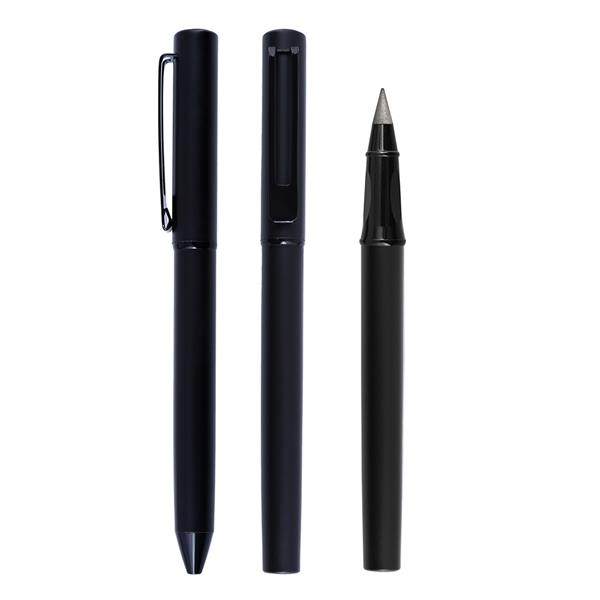 Gumka do ścierania ołówka Kolor wkładu – niebieski Zawiera wieczny ołówek i długopis Pudełko w cenie Materiał: Aluminium Rozmiar: 18,5 x 6 x 2,5 cm Kolor: czarny Znakowanie: 235600000
