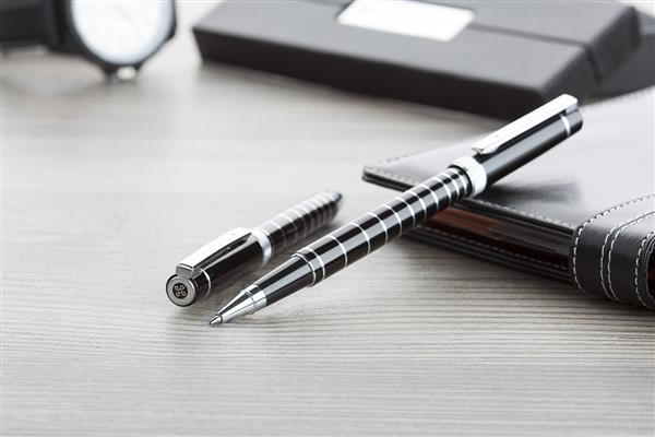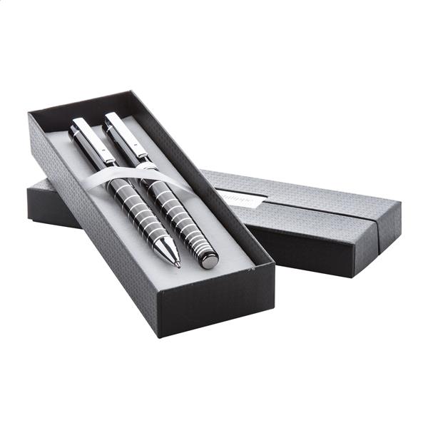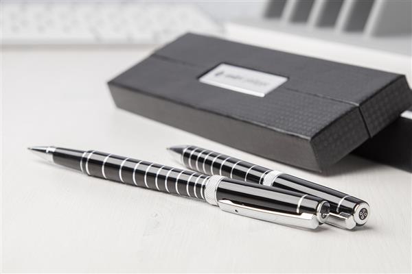 André Philippe, elegancki zestaw – długopis i pióro kulkowe z chromowanymi pierścieniami, dostarczane w czarnym pudełku z niebieskim wkładem.