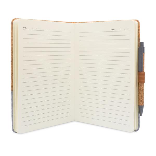 Elegancki notes łączący naturalny korek z płótnem. Rozmiar A5, 80 kartek w linie (gramatura 70 g/m2). Wyposażony w długopis wykonany z korka, słomy pszennej i PP. Pakowany w pudełko.