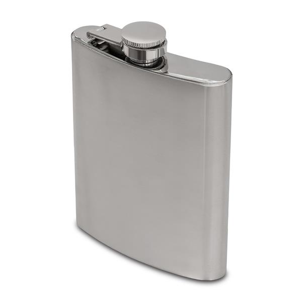 Piersiówka ze stali nierdzewnej w zestawie z dwoma kieliszkami i lejkiem. Pojemność 230 ml. Zapakowana w czarne pudełku.