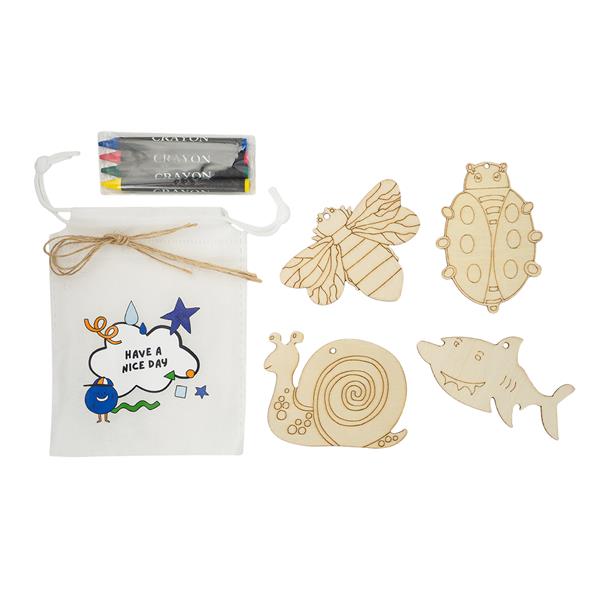 Zestaw zawieszek wykonanych z drewna. W zestawie znajdują się 4 różne wzory oraz kredki świecowe, którymi można pokolorować zawieszki.