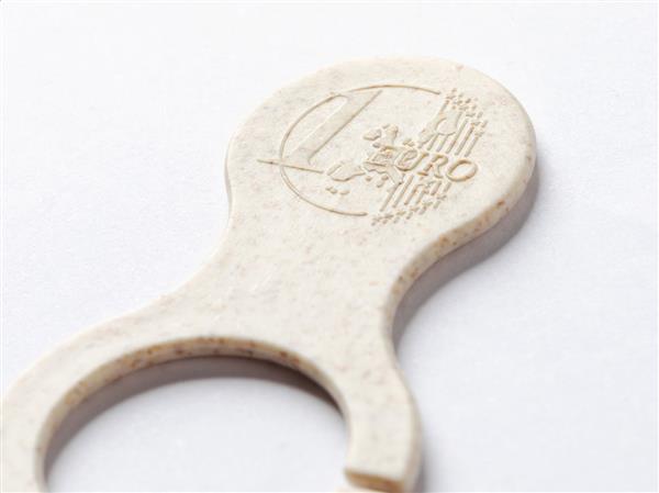 Ekologiczna żeton do wózka sklepowego ze słomy pszenicznej i plastiku ABS, z symbolem euro po jednej stronie. Możliwość nadruku tylko z jednej strony.