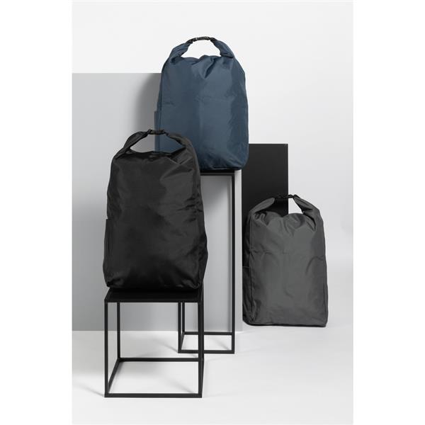 Plecak, zwijane zamknięcie na zatrzask, przestronna przegroda główna, wykonany z RPET, do którego produkcji zostało ponownie wykorzystanych 11,6 butelek PET, dzięki zastosowaniu technologii śledzącej AWARE™ wykorzystane włókna są identyfikowalne z pochodzenia oraz wyprodukowane zostały zgodnie z ideą zrównoważonego rozwoju, 2% wpływów z każdego sprzedanego produktu z kolekcji Impact jest przekazywane na rzecz Water.org