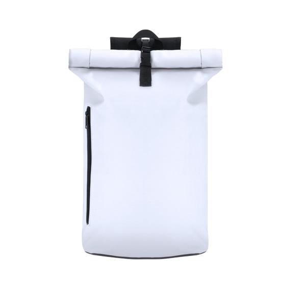 Zwijany plecak na laptopa 15″, rozwijalna główna kieszeń zamykana na klamrę, która umożliwia zwiększanie pojemności plecaka oraz lepiej chroni przed czynnikami atmosferycznymi po zwinięciu, miękka przegroda na laptopa, przednia kieszeń na zamek błyskawiczny, miękki tył i regulowane paski na ramię, produkt wykonany z PU