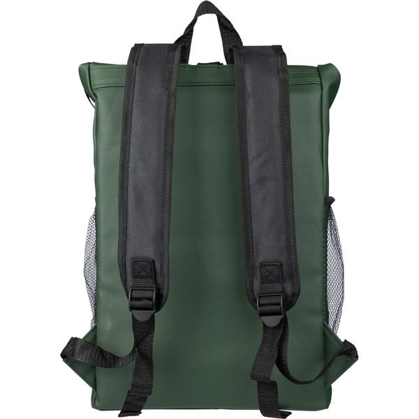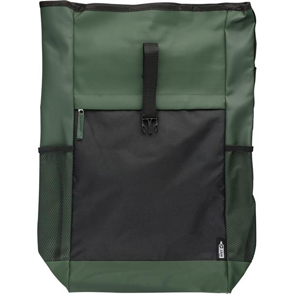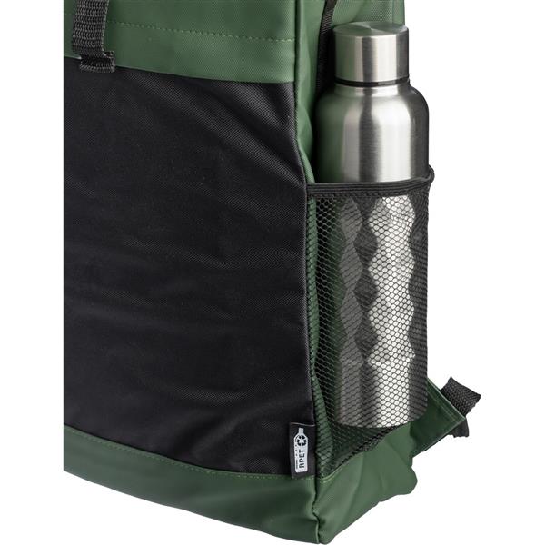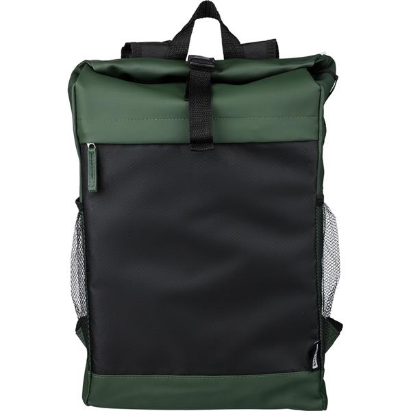 Zwijany plecak na laptopa z zapięciem na rzep, 5 kieszeni, w tym jedna na laptopa 15″, pojemność: 25 l, udźwig: 15 kg, wodoodporna powłoka z PU, ikona RPET na metce, produkt wykonany z RPET