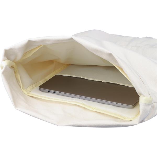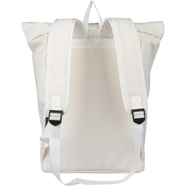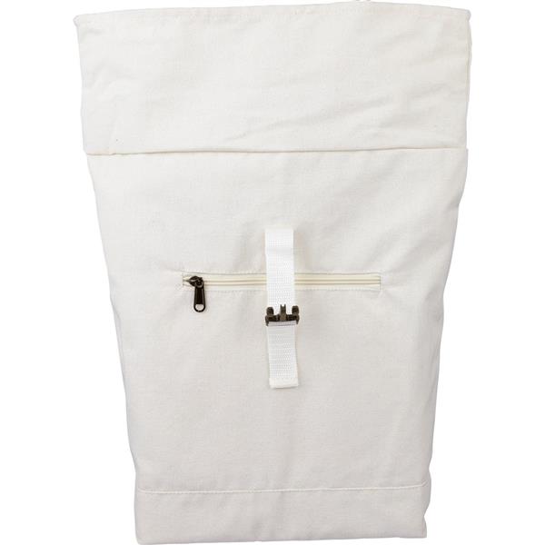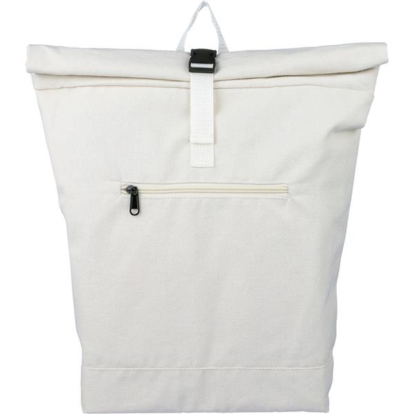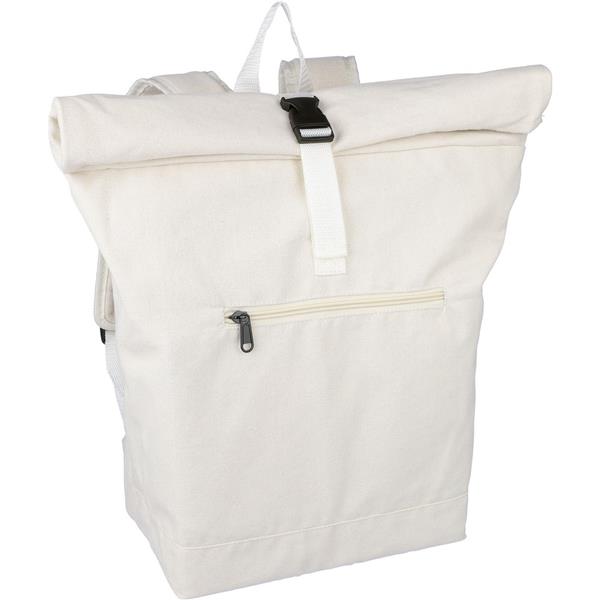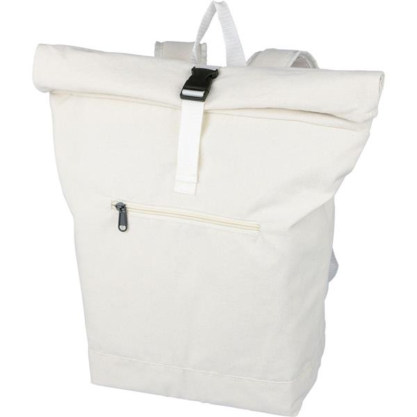 Zwijany plecak, pojemność 15L, duża komora zapinana na zamek z przegrodą na laptopa 15″, dwie wewnętrzne kieszenie, jedna zewnętrzna kieszeń, konstrukcja obejmuje uchwyt do przenoszenia na górze, wyściełane regulowane szelki, mała przednia kieszeń na zamek, maksymalne obciążenie: 14 kg, produkt wykonany polibawełny z recyklingu (330 g/m2), podszewka z poliestru 210D, plastikowe zapięcie na klamrę