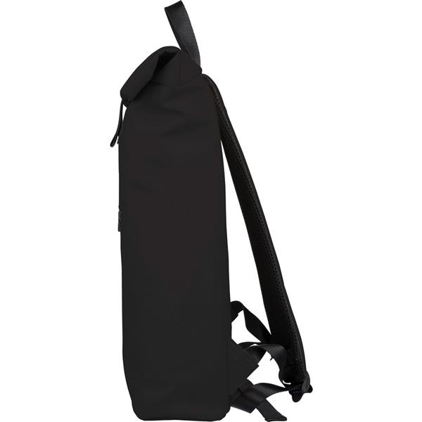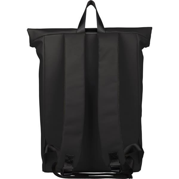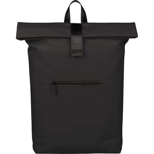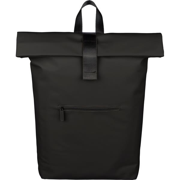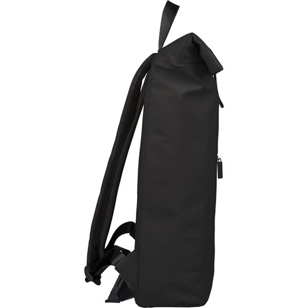 Zwijany plecak o pojemności 19 litrów, mała kieszeń zapinana na zamek z przodu, zwijana główna kieszeń zamykana na rzep, przegroda na laptopa 16″ w środku, regulowane wentylowane paski na ramię, uchwyt z wierzchu ułatwiający noszenie, podszewka z poliestru 210D, ikona recyklingu na metce, produkt wykonany z PU z recyklingu i poliestru