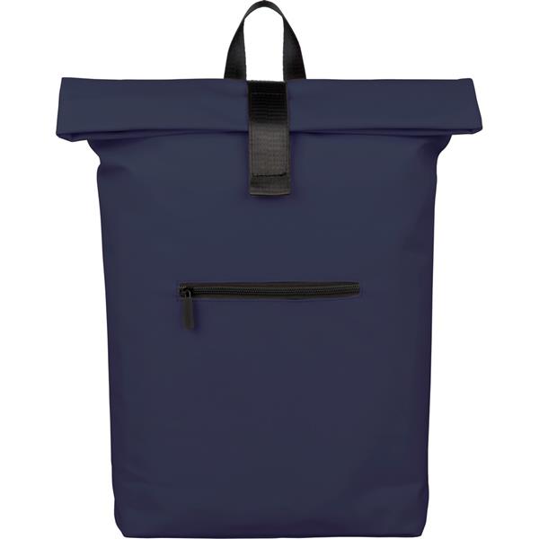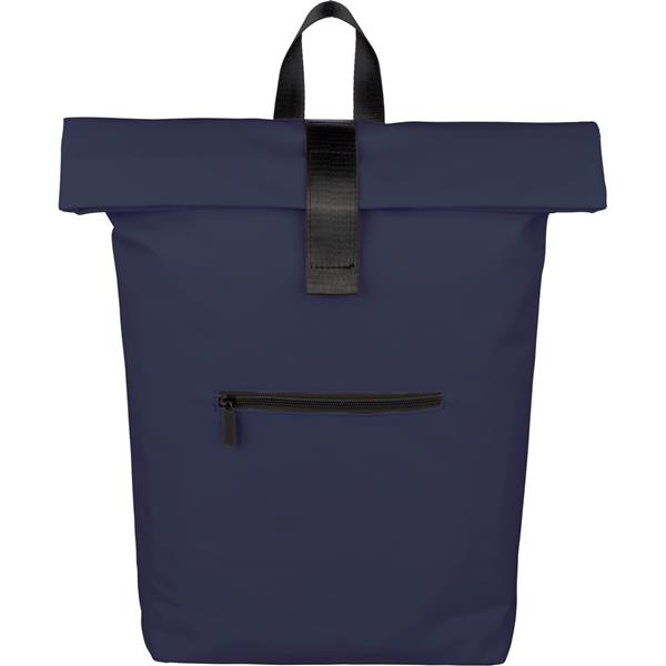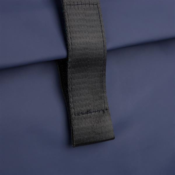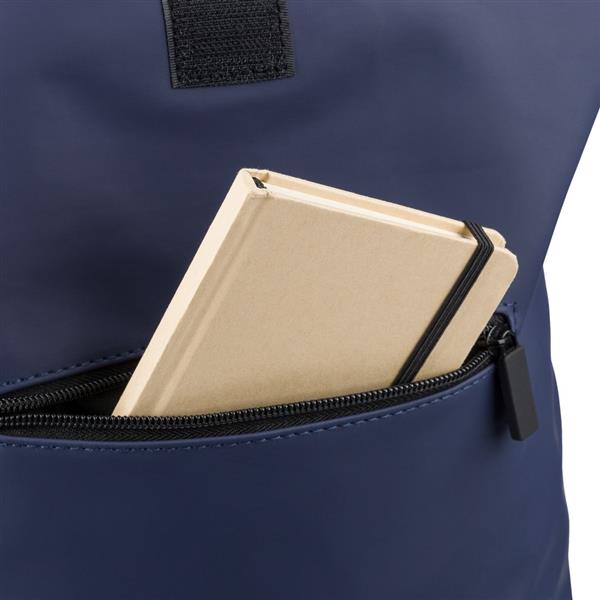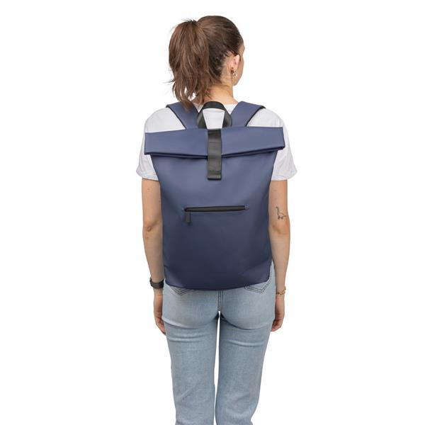 Zwijany plecak o pojemności 19 litrów, mała kieszeń zapinana na zamek z przodu, zwijana główna kieszeń zamykana na rzep, przegroda na laptopa 16″ w środku, regulowane wentylowane paski na ramię, uchwyt z wierzchu ułatwiający noszenie, podszewka z poliestru 210D, ikona recyklingu na metce, produkt wykonany z PU z recyklingu i poliestru